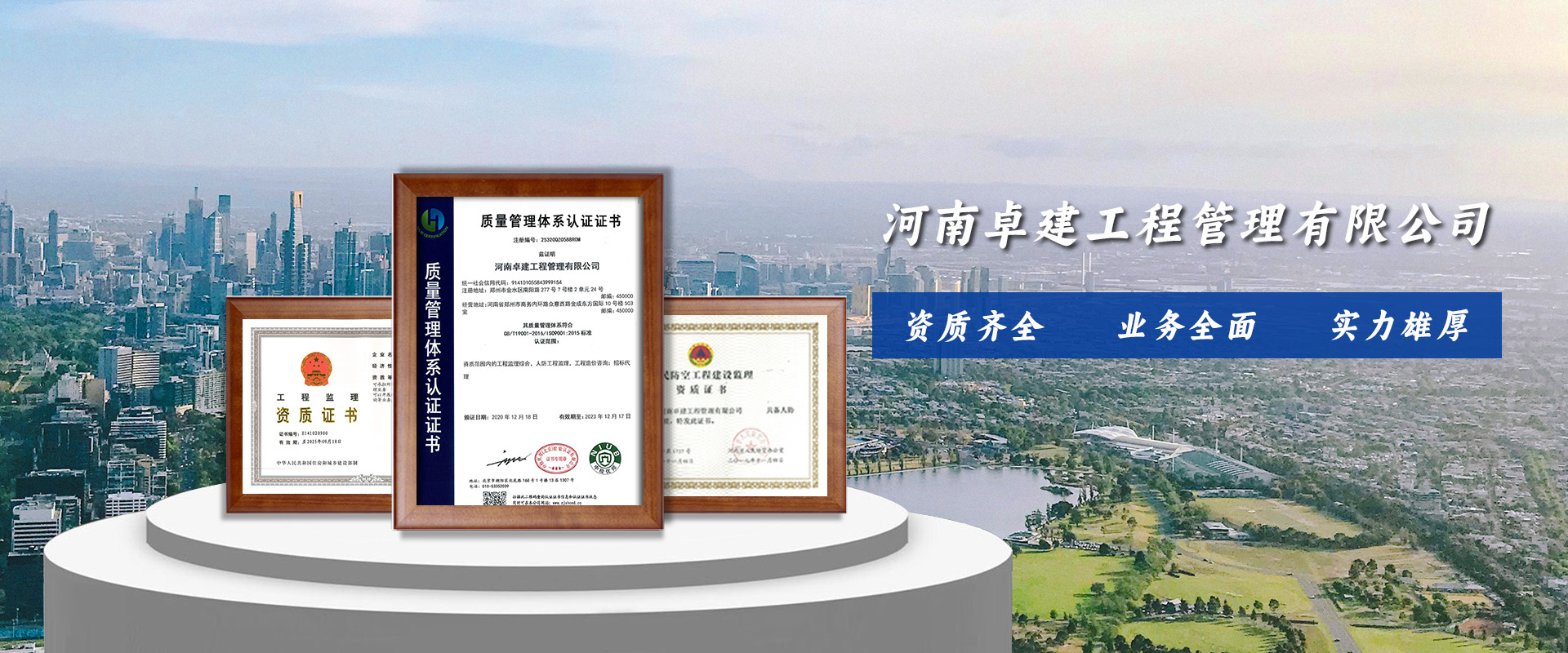 河南卓建工程管理有限公司(前身名為河南卓建建筑工程監(jiān)理有限公司)是經(jīng)鄭州市工商行政管理局批準(zhǔn),成立于2011年,經(jīng)營(yíng)業(yè)務(wù)范圍包括建筑工程監(jiān)理、工程監(jiān)理、工程項(xiàng)目管理、招標(biāo)代理、造價(jià)咨詢(xún)等,具有工程監(jiān)理綜合資質(zhì)、人防工程丙級(jí)資質(zhì)、造價(jià)咨詢(xún)資質(zhì)乙級(jí)。公司已通過(guò)質(zhì)量管理體系認(rèn)證、職業(yè)健康安全管理體系認(rèn)證、環(huán)境管理體系認(rèn)證,公司是河南省監(jiān)理協(xié)會(huì)會(huì)員單位。