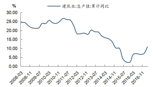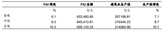 我們依然利用線(xiàn)性回歸對(duì) 2017 年的行業(yè)增長(zhǎng)做出預(yù)測(cè), 悲觀(guān)情況下, 如果 FAI增速下滑到 6.1%,則建筑業(yè)總產(chǎn)值增速為 7.1%,中性情況下,F(xiàn)AI 增速為 8.1%,則建筑業(yè)總產(chǎn)值增速為 8.7%, 樂(lè)觀(guān)情況下, 如果 FAI 增速回升至 10.3%, 則行業(yè)增速將回升至 10.7%。從模型的結(jié)果來(lái)看, 行業(yè)增速開(kāi)始高于 FAI 增速, FAI 對(duì)行業(yè)的拉動(dòng)作用出現(xiàn)上升, 我們認(rèn)為主要還是由于 FAI 的結(jié)構(gòu)變化, 基建和房地產(chǎn)作為對(duì)建筑業(yè)拉動(dòng)較大的板塊, 在 FAI 中的占比的提高。