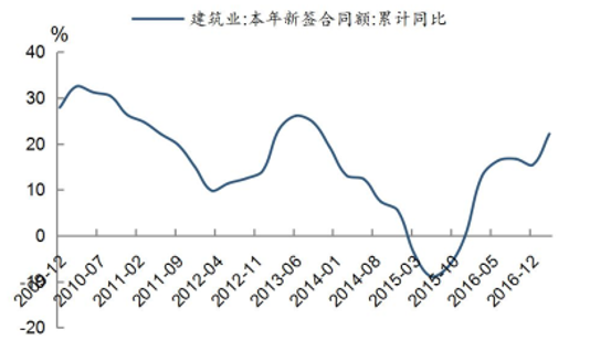 截至 2017, 建筑業(yè)總產(chǎn)值增速為 10.82%, 較 2016 年全年 7.09%的增速提升3.74 個(gè)百分點(diǎn), 主要因?yàn)榻衲暌詠?lái), 基建投資、 房地產(chǎn)投資都保持了較快增長(zhǎng),行業(yè)景氣度有所上升。截至 1Q2017, 建筑業(yè)本年新簽合同額累計(jì)同比增長(zhǎng) 22.17%, 達(dá)到近三年來(lái)最高水平, 較 2016 年全年增速 15.38%提高 6.79 個(gè)百分點(diǎn), 較去年同期提高 9.26個(gè)百分點(diǎn), 顯示需求一定程度的持續(xù)回暖。