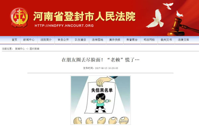 據(jù)介紹,河南省登封市法院在全省首創(chuàng)給老賴們“定制”手機彩鈴。“我們就是要在老賴朋友圈‘高調(diào)公布’他是失信被執(zhí)行人,他是欠錢不還的老賴,讓他們精神上有壓力,以此敦促他們自覺履行義務(wù)。”登封市法院執(zhí)行局負責人楊軍說。